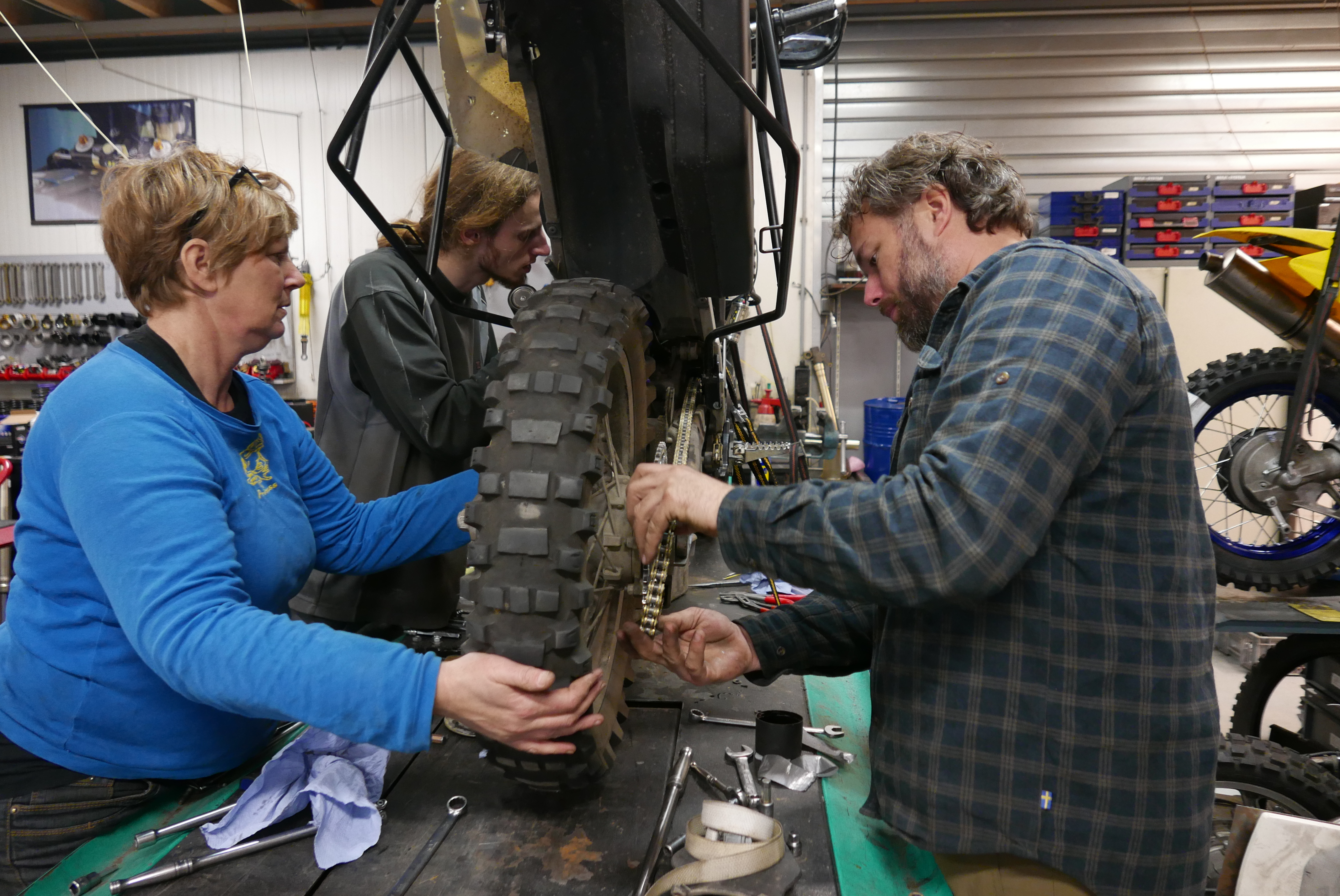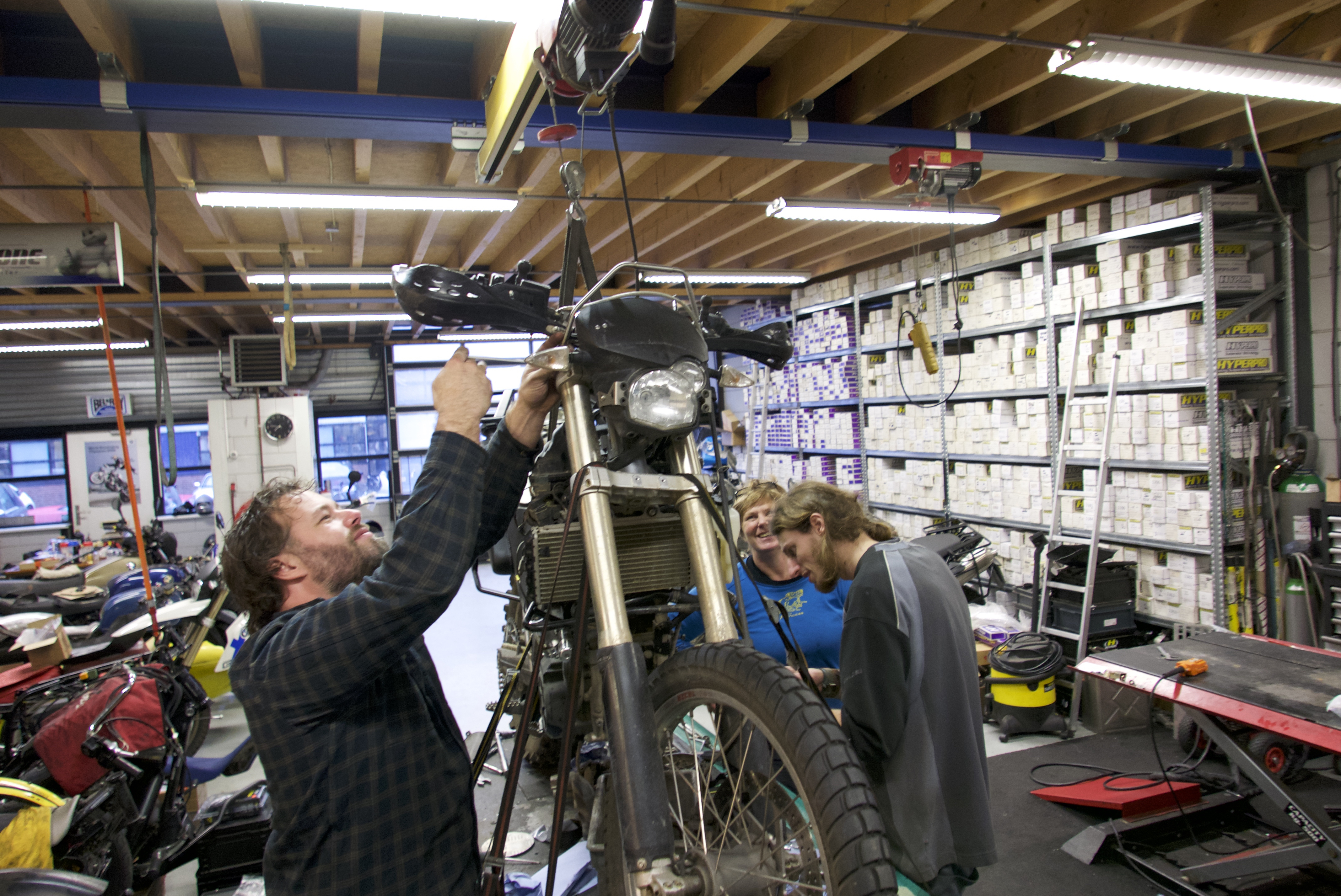 Van de reis met Marika, nu al weer bijna vier jaar geleden, heb ik nog steeds contact met Hyperpro via Paul. Inmiddels ken ik Bas, die bij Hyperpro in Alphen werkt ook al vanuit het GS circuit. Bas is de man voor de X Challenge. Hij heeft er al velen onderhanden genomen. Via Paul kan ik officieel vanuit Hyperpro bij Bas aankloppen om de motor verder te inspecteren. Hoewel er al Hyperpro vering onder zit, kan het geen kwaad om deze te laten checken. Het komt er op neer, dat mijn steeds mooier wordende brommer (zo naast de 1150 is ie dat voor mij nog steeds) na drie dagen een metamorfose heeft ondergaan. En ik ook. Het was echt geweldig dat ik er bij kon zijn en zo nu en dan zelf aan het werk mocht onder supervisie van Bas en collega David (al heb ik het idee, dat ik meer in de weg stond als dat ik van nut was 😉 ).